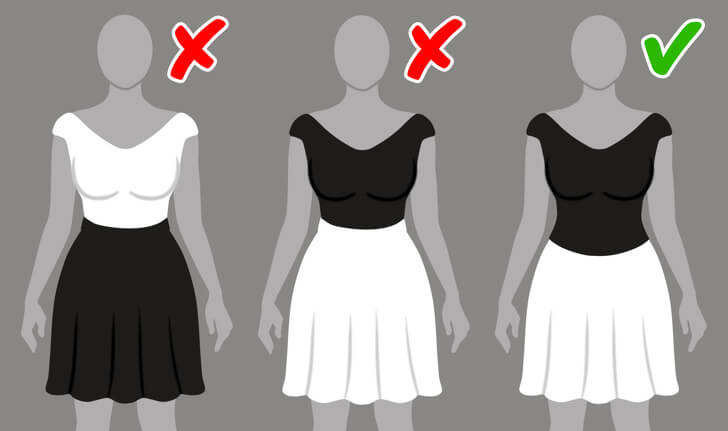 الألوان الخفيفة تجعلك تبدين أكبر حجماً مما أنت عليه، والداكنة على عكس ذلك ستجعلك تبدين أنحف وأكثر أناقة.لذلك فإن أفضل الطرق للحصول على خصر نحيل هو ارتداء لون واحد. أو فصل الجزء العلوي عن السفلي بلونين مختلفين مع الحرص على أن يكون الأعلى أغمق